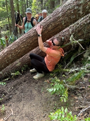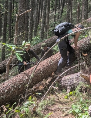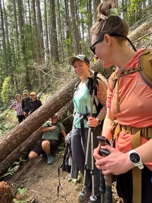 We had a warm, sunny spring day to hike up to Rooster Rock in the Old Cascades below Tombstone Pass (7 miles RT and 2,300 ft of gain). We sighted early spring wildflowers, including Calypso orchids (or fairy slippers), trillium, anemone, wood violets, and oaks toothwort. There were also signs of beargrass blooms to come. We had a long, but entertaining climb over and under 15 downed trees across the trail. Many of the trees had fallen in groups of two's and three's, which made for creative contortions to get over and under them through narrow spaces between the large trees. It required a team effort as Chemeketans (ages 29-82) pushed and pulled each other over and under the large trees. Finally Rooster Rock came into view. After admiring this bare rock pinnacle, which used to have a fire lookout perched on top, we continued on up to the unnamed rocky knoll for views up the South Santiam canyon to the snowy tops of the Three Sisters.